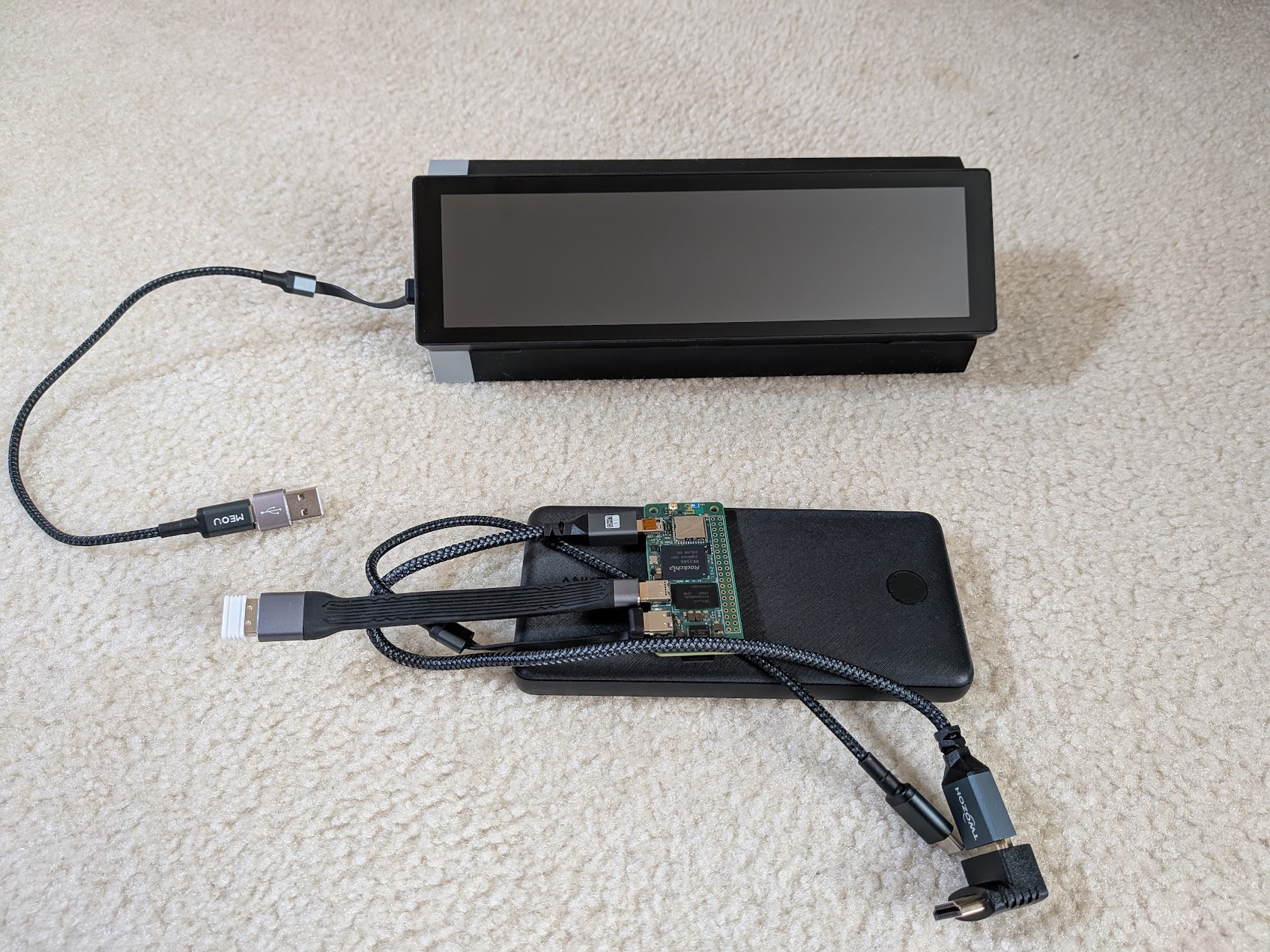 Under the hood it runs a Radxa Zero 3W, a Pi-Zero-form-factor SBC with 2GB of RAM (just barely sufficient to run a desktop environment with i3 WM). Originally I started with a full size RasPi 5 (shell pictured below), but I liked the smaller size much better. It hosts a keyboard dongle, HDMI out to a 1080x480 wide aspect ratio monitor, and a 20Ah battery pack to keep it rolling on the go. I modeled a shell in OpenSCAD and we were off to the races!