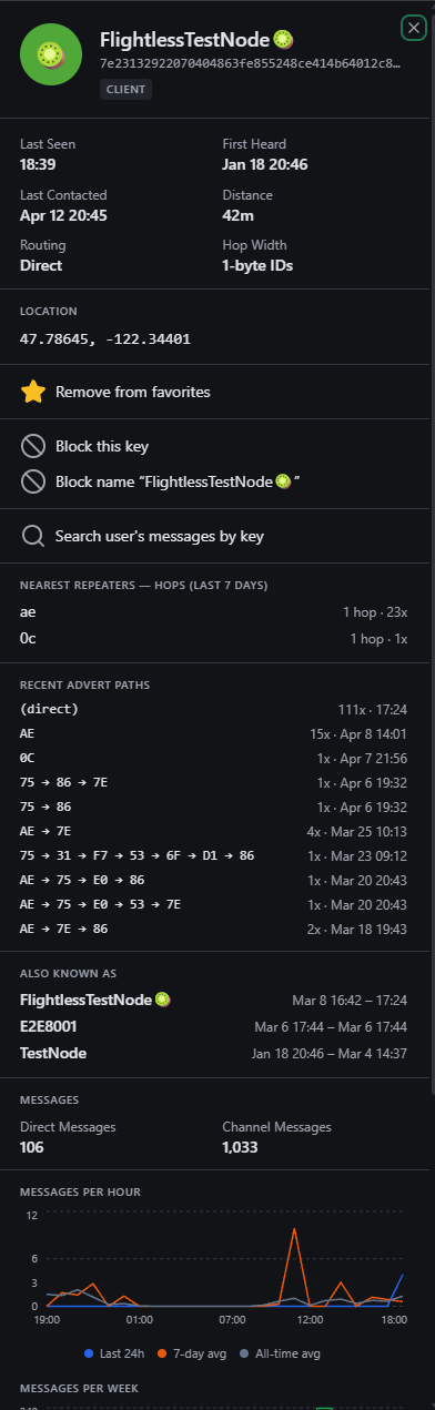 Provides the MeshCore key for the given contact and information about when they were last heard (advert, message, etc.), and the method (direct, or what path the packet took)