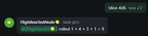 This bot provides simple dice-rolling capabilities, requested in standard form (e.g., “3d6” means roll 3 six-sided dice).