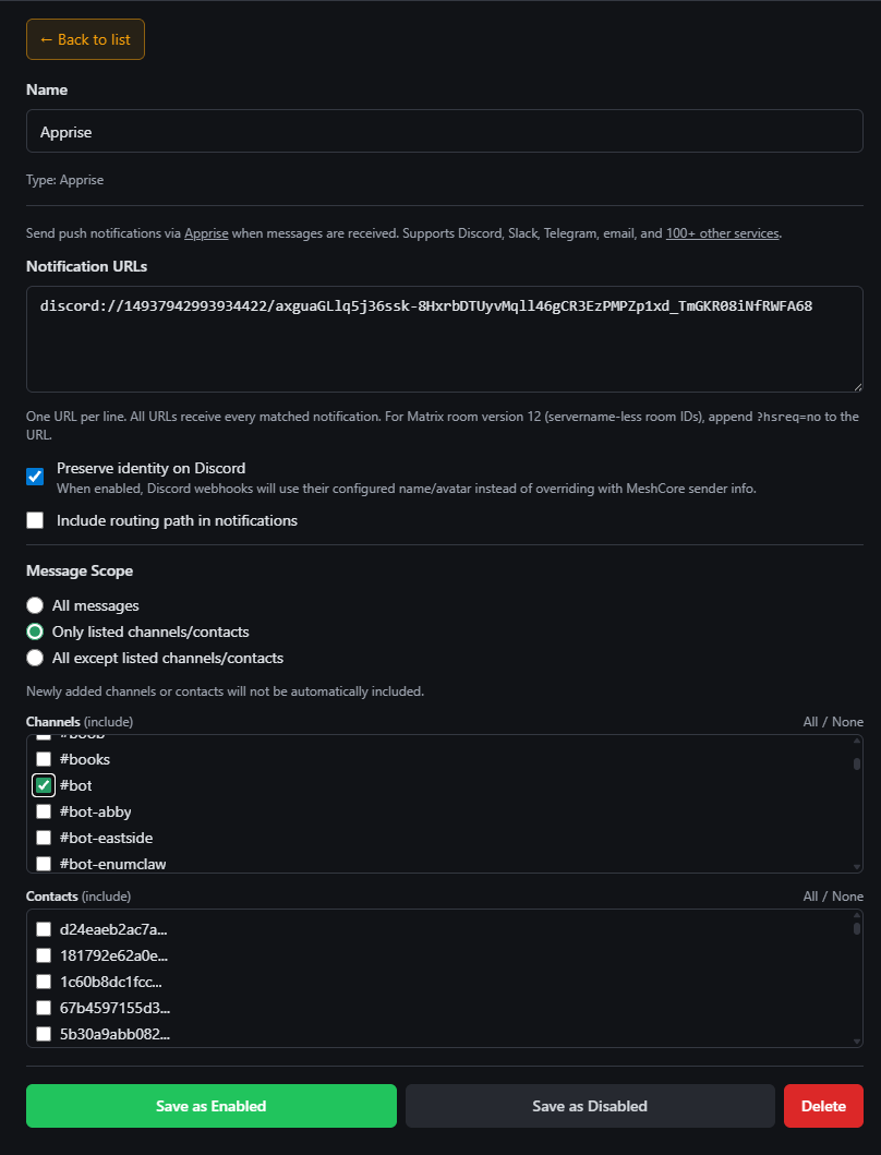 As an example, we’ll use Apprise to forward all messages in a particular MeshCore channel to Discord via RemoteTerm.