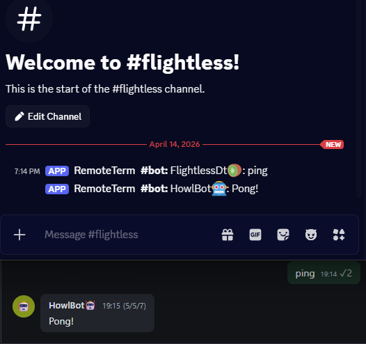 Once enabled, you should see messages begin to flow! If you have trouble or don’t see messages you expect, check the server logs for any reported errors, or try enabling all channels to ensure that at least the RemoteTerm <=> Discord linkage is working.