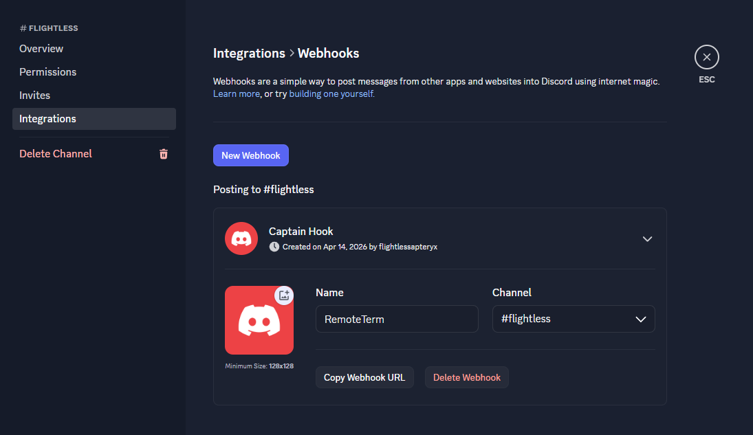 Name the webhook appropriately and copy the webhook URL. The webhook should take the form of https://discord.com/api/webhooks/<WebhookID>/<WebhookToken>