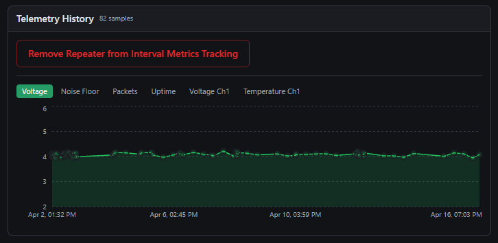 In order to take advantage of repeater telemetry tracking, you will need to enroll the desired repeaters in automatic telemetry fetch. Once enrolled, RemoteTerm will request telemetry at a configurable interval, retaining historical values and making up-to-date values visible in Home Assistant. To configure automatic telemetry fetch, log in to your desired repeater in RemoteTerm by selecting it in the sidebar and providing credentials. Scroll to the bottom and click “Opt Repeater into 8hr Interval Metrics Tracking”. Once enrolled, metrics will be fetched by default every 8th hour in the UTC time zone (midnight, 8:00 AM, 4:00 PM). After successful enrollment, data metrics will show collection within 24 hours.