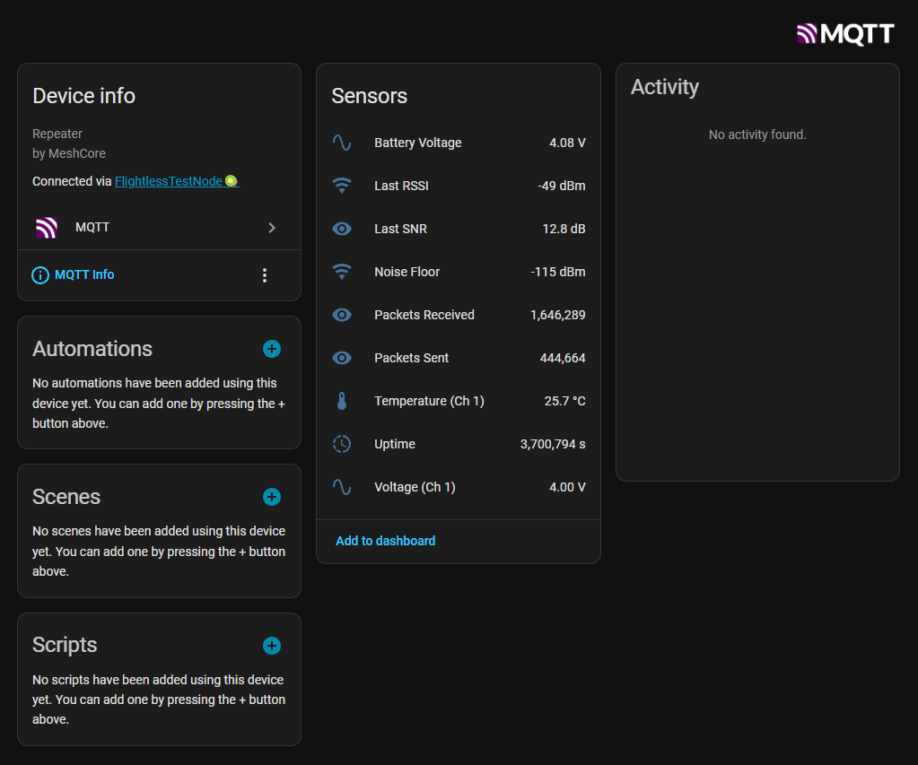 Home Assistant provides a framework for simple-to-use, powerful home automation. RemoteTerm offers integration with Home Assistant via the built-in MQTT integration (MQTT Discovery). With this integration, you can trigger automations based on messages, monitor repeaters and local radio telemetry, and track contacts via GPS in their advertisements.