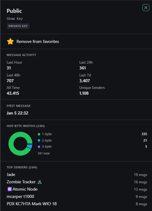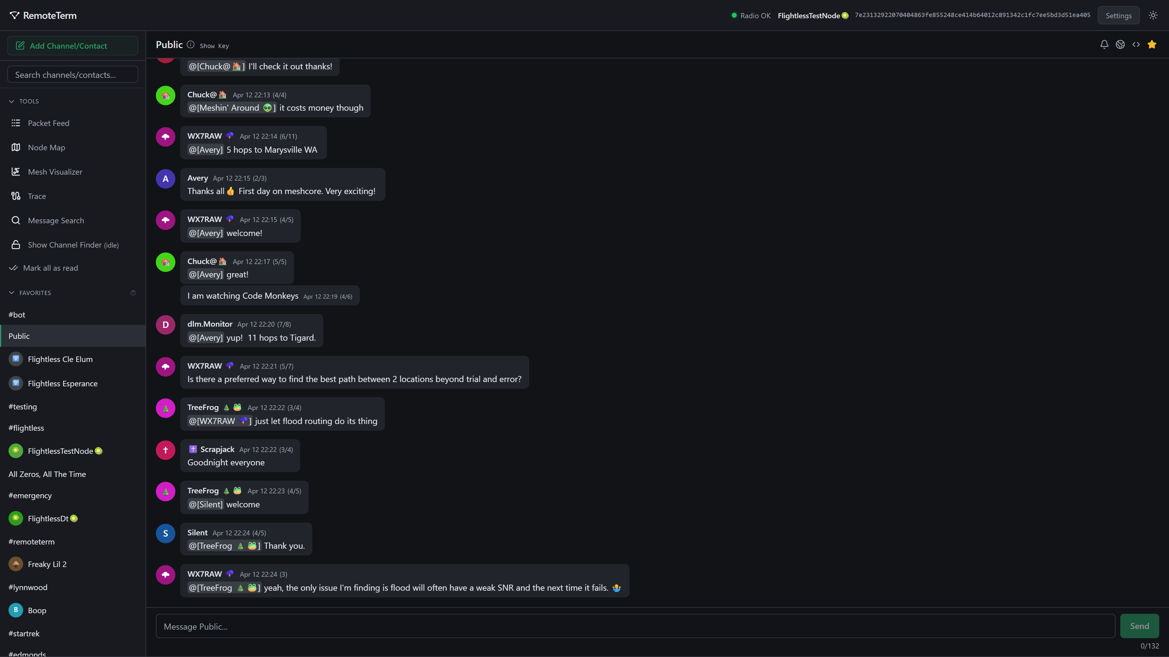 The Public channel is added automatically to all new RemoteTerm instances. Your local mesh will likely have its share of active channels: Public, #test or #testing, and #bots or #bot can be good places to get started or find people who can point you to good local rooms for newcomers.