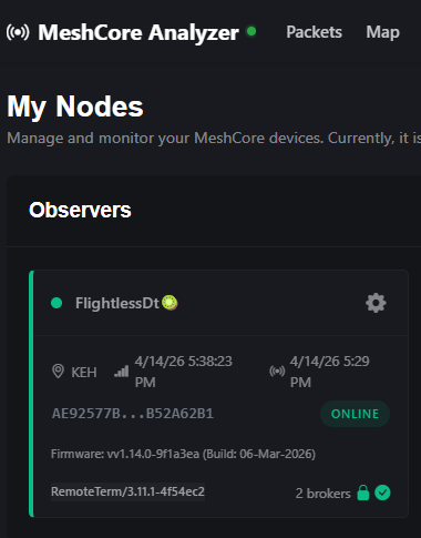 Now, navigate to https://analyzer.letsmesh.net/my-nodes. Within about 15 minutes, you should see your radio appear green there, and your own telemetry and packets being forwarded to LetsMesh!