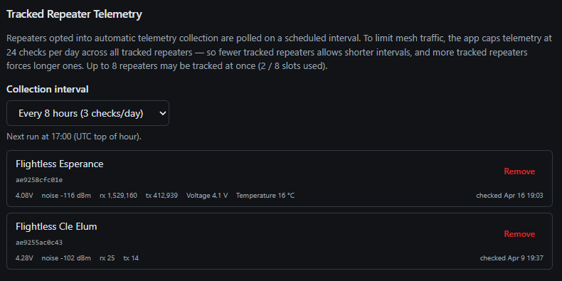 Automated repeater telemetry fetch has a customizable interval; you may choose a frequency ranging from once hourly to once daily, with the restriction that automated fetches may not exceed 24 in one 24-hour period. Thus, a single repeater may be checked at most hourly, two repeaters may be checked at most every two hours, and the maximum of eight tracked repeaters may be checked at most every eight hours.